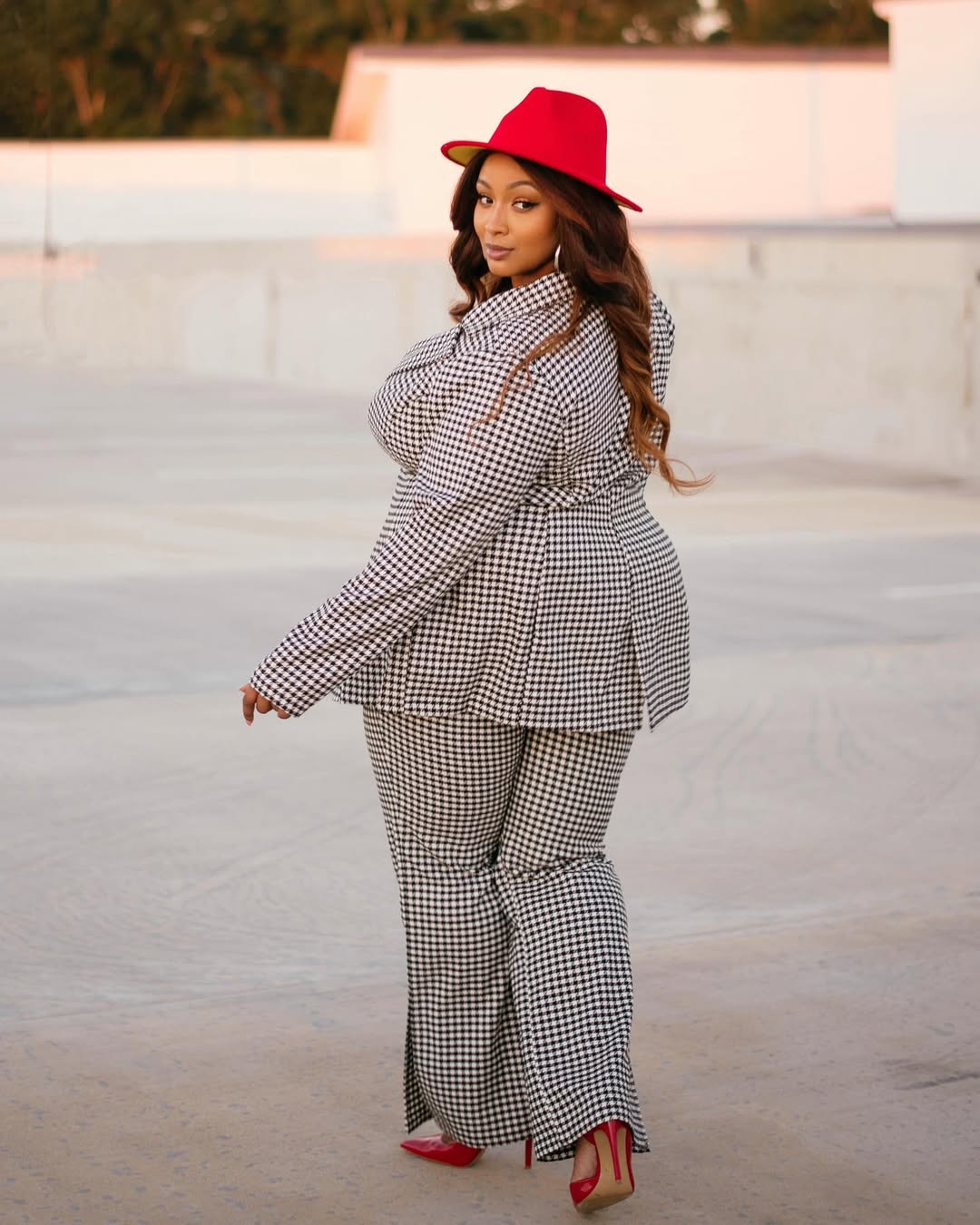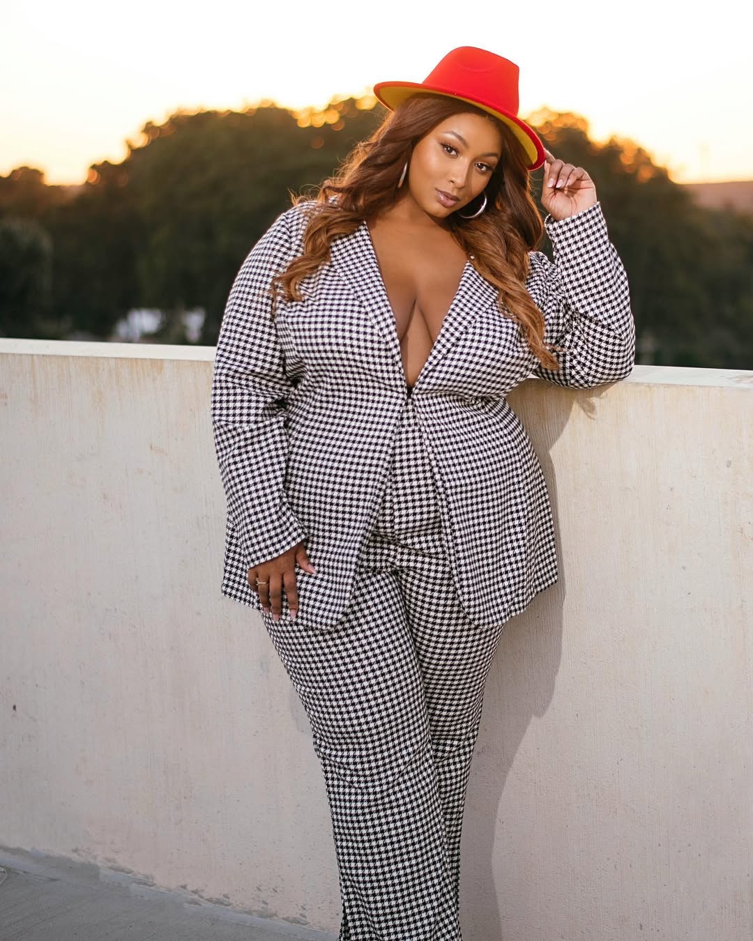 Preowned blazer and pant set in houndstooth print. Original tags attached .