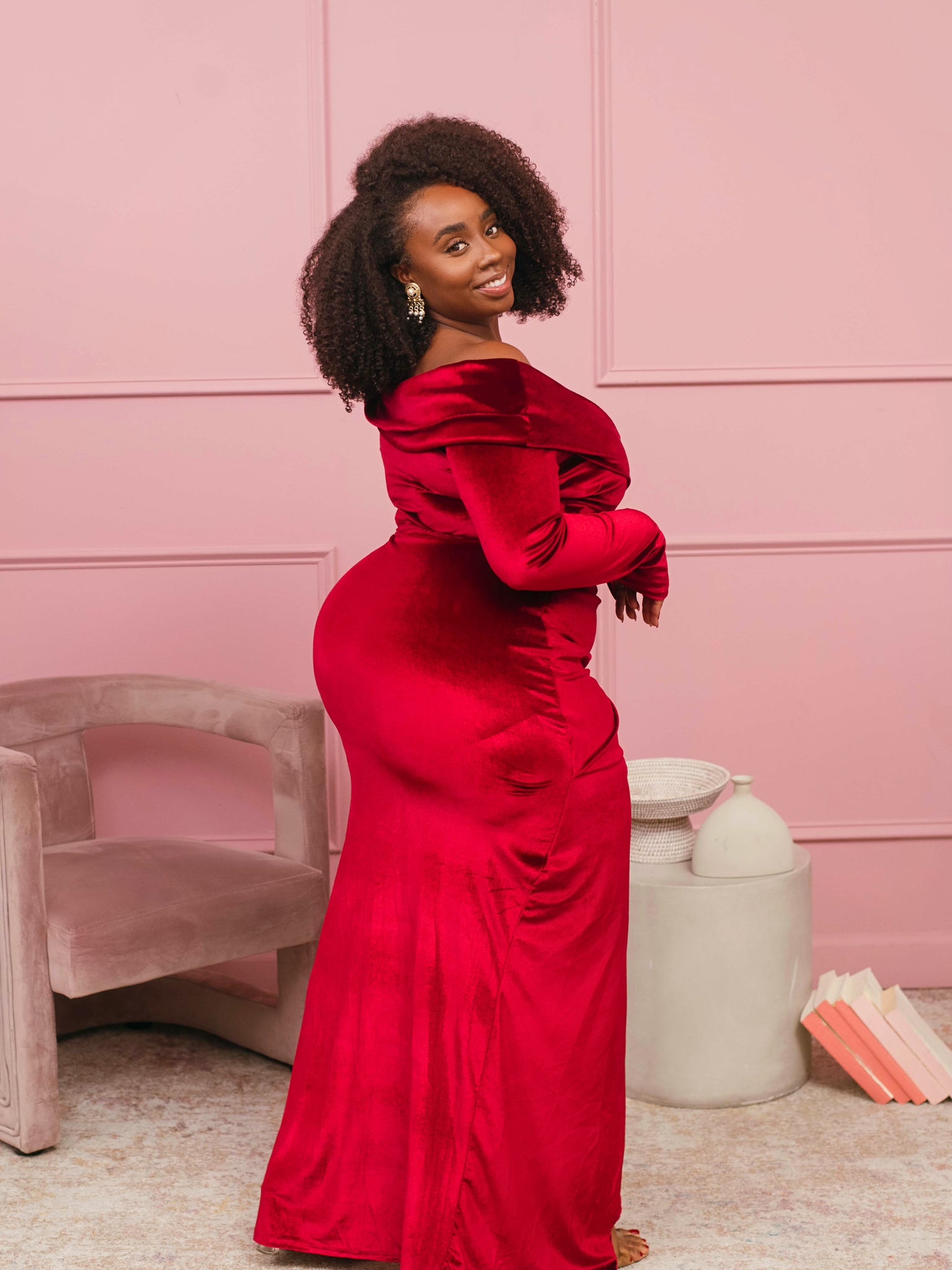 Be the center of attention in this off-shoulder long-sleeve gown. It’s elegant and an absolute show-stopper.
